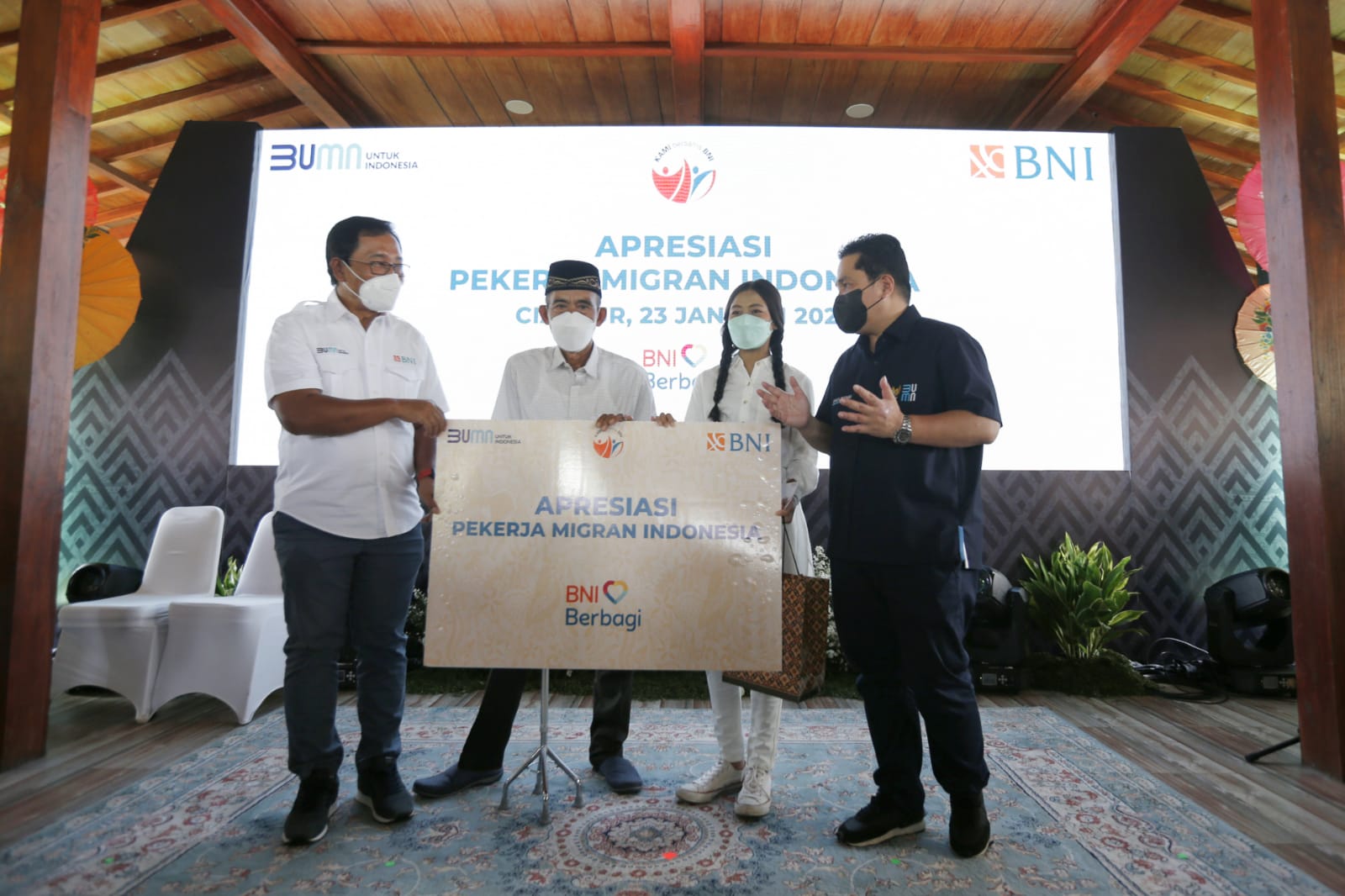 Apresiasi tersebut diserahkan langsung secara simbolis oleh Erick Thohir di Kota Cianjur, Jawa Barat, Minggu (23/1/2022). Dalam seremoni yang menerapkan protokol kesehatan secara ketat ini, Direktur Hubungan Lembaga BNI Sis Apik Wijayanto dan Deputi Bidang Penempatan dan Perlindungan Kawasan Eropa dan Timur Tengah – Inspektur Jenderal Polisi Achmad Kartiko ikut pula mendampingi penyerahan tabungan secara simbolis tersebut.